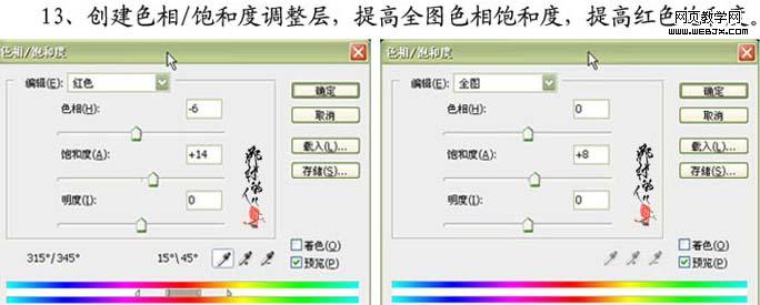 13、創(chuàng)建色相/飽和度調(diào)整圖層,提高全圖色相飽和度,提高紅色飽和度,參數(shù)及效果如下圖。