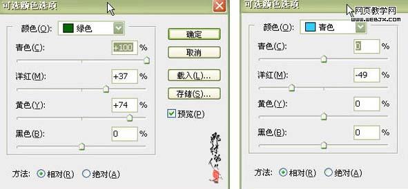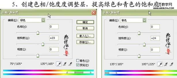 5、創(chuàng)建色相/飽和度調(diào)整圖層,提高綠色和青色的飽和度,參數(shù)及效果如下圖。