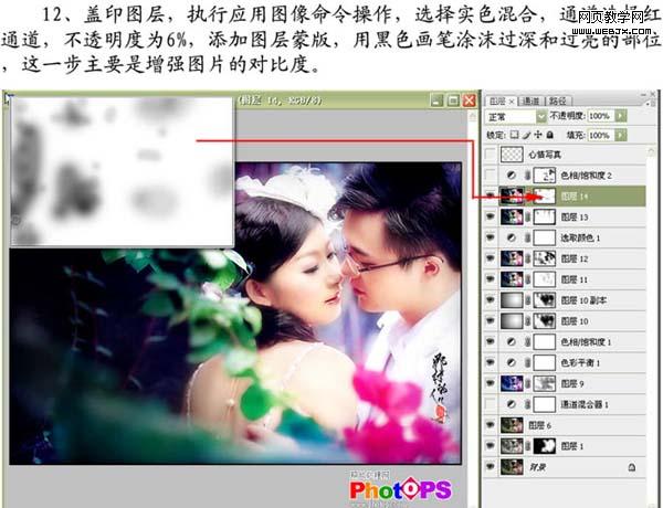 12、新建一個圖層,蓋印圖層,執(zhí)行:圖像 > 應(yīng)用圖像操作,選擇實(shí)色混合,通道選擇紅通道,不透明度為6%,添加圖層蒙版,用黑色畫筆涂抹過深和過亮的部位,這一步主要是增強(qiáng)圖片的對比度。