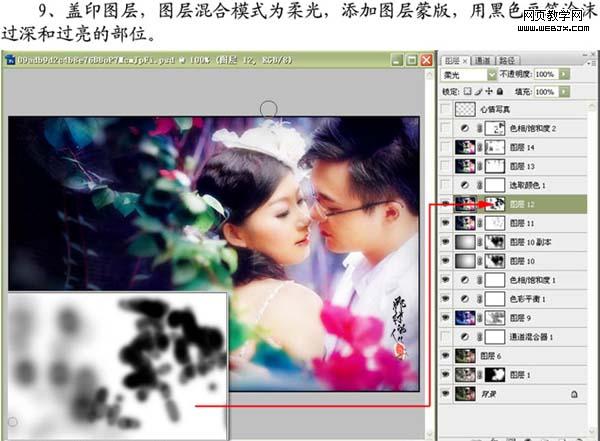 9、新建一個圖層,蓋印圖層,圖層混合模式改為“柔光”,添加圖層蒙版,用黑色畫筆涂抹過深和過亮的部位。