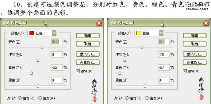 10、創(chuàng)建可選顏色調(diào)整圖層,分別對紅色、黃色、綠色、青色進(jìn)行調(diào)整,參數(shù)及效果如下圖。