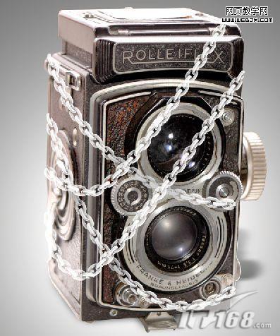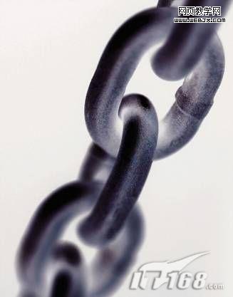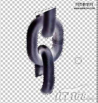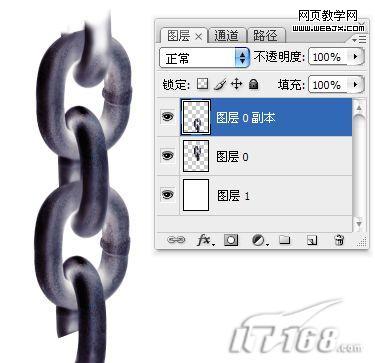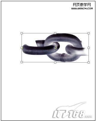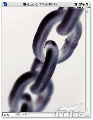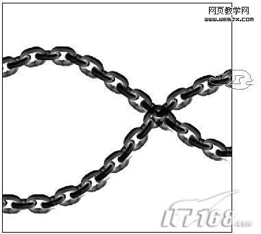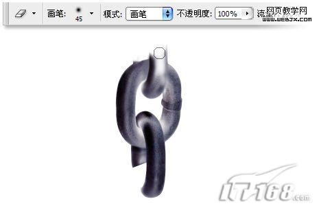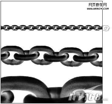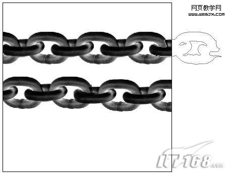 (6)在“圖層0”的下方新建“圖層1”,白色填充畫布,便于觀察操作效果,單擊工具箱中的“橡皮擦工具”,將鐵鏈上部擦為漸隱效果,如圖09所示。
