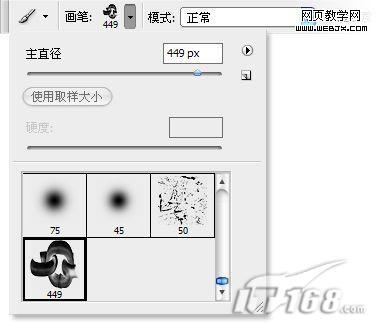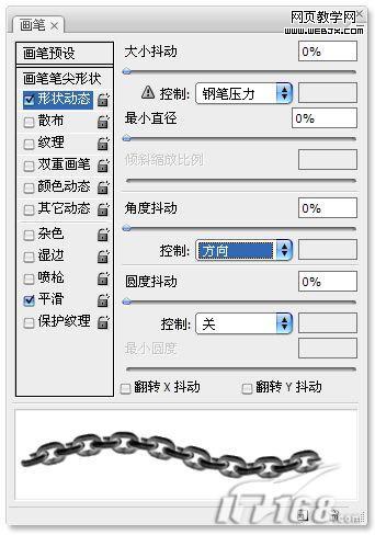 (11)單擊工具箱上面的“畫筆工具”,打開選項欄中的畫筆下拉菜單,選擇儲存的“鐵鏈”畫筆,如圖14所示。