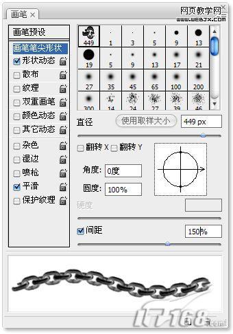 (12)打開“畫筆”面板,在“畫筆預設”對話框中,在“形狀動態(tài)”選項中,在“角度抖動”中的“控制”文本框中選擇“方向”,在“畫筆筆尖形狀”選項欄中“間距”設置為150 %,如圖15、圖16所示。