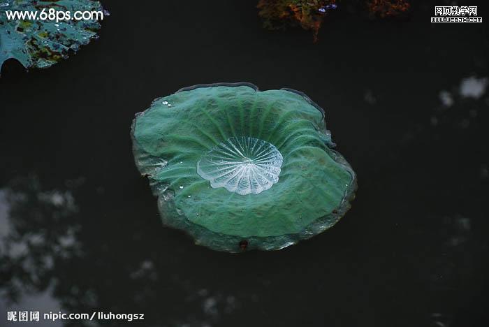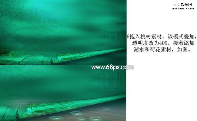 6、拖入桃樹素材,圖層混合模式改為“疊加”,圖層不透明度改為:40%。接著添加湖水和荷花素材,效果如下圖。