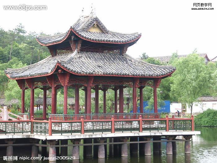 5、投入亭子素材,圖層混合模式改為“正片疊底”,把圖層不透明度改為:31%,調整下亭子的大小。