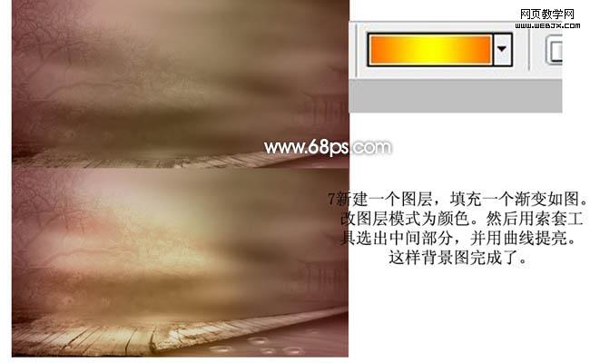 7、新建一個圖層,選擇漸變工具,顏色設置如下圖,然后填充漸變。確定后把圖層混合模式改為“顏色”。用套索工具選出中間部分,并用曲線提亮。這樣背景圖完成了。