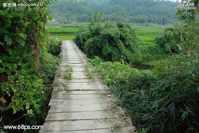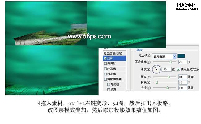 4、打開下圖所示的素材,按ctrl + t 右鍵變形,適當調整好大小,然后摳出木板路,圖層混合模式改為“疊加”,然后添加投影效果,參數設置如下圖。