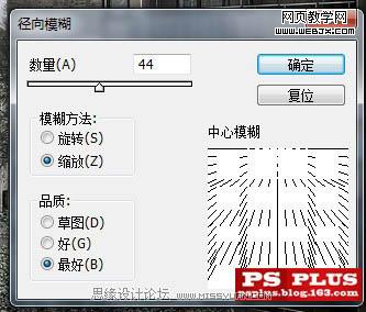 3、對這一層執行濾鏡 > 模糊 > 徑向模糊。需要說明的是。模糊的數量越大。光線的長度就越大。模糊中心就是光線散發的中心。