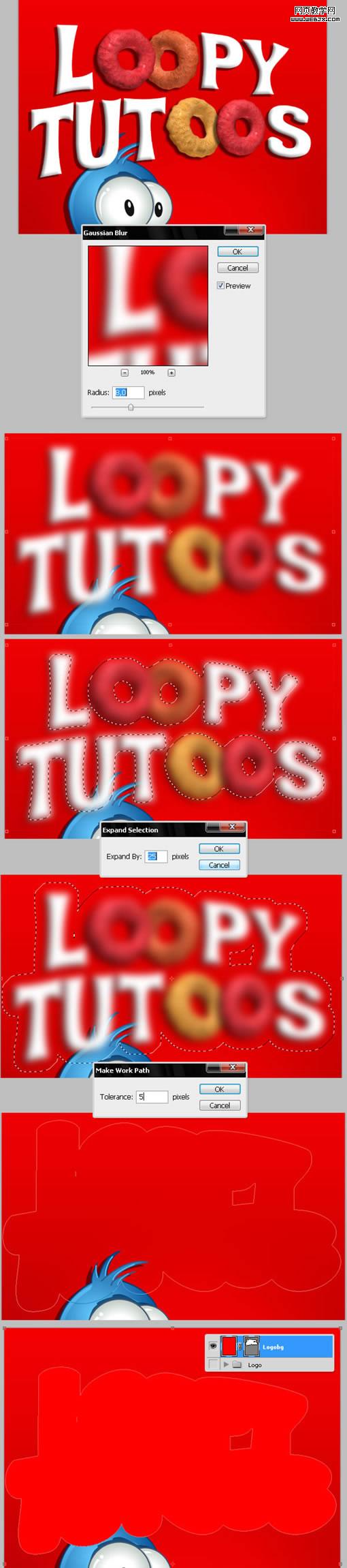 復(fù)制“logo”文件夾,對其光柵化并且增加高斯模糊效果,然后在圖層面板中按住crtl并點擊模糊后的圖層來創(chuàng)建一個圍繞文字的選區(qū)。擴(kuò)大選區(qū),25個像素。然后選取選區(qū)工具,按住alt點擊選區(qū)然后將其變?yōu)楣ぷ魍ǖ溃瑢olerance的值調(diào)為5像素然后點擊ok。最后,選擇layer > vector mask > current path 并且用紅色之類的參考色填充蒙版圖層。將其命名為“logobg”
