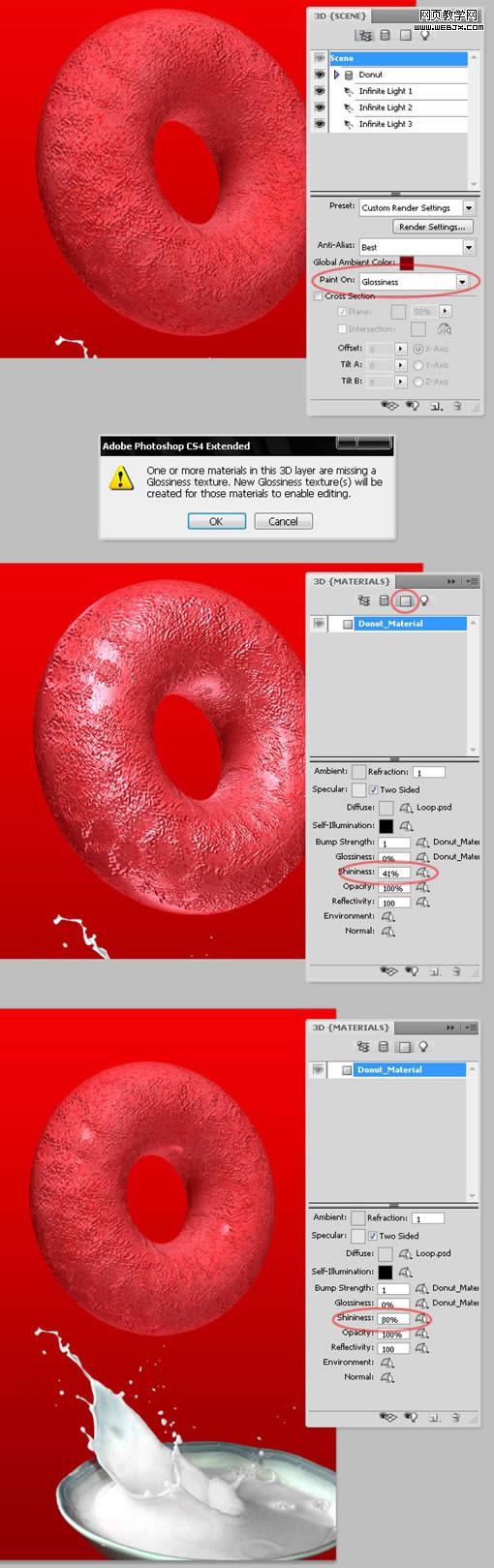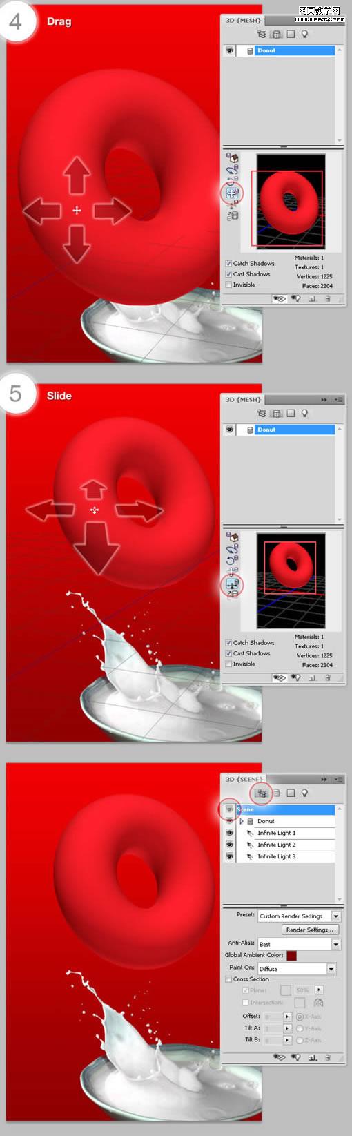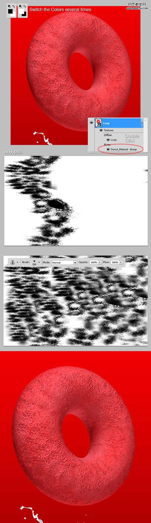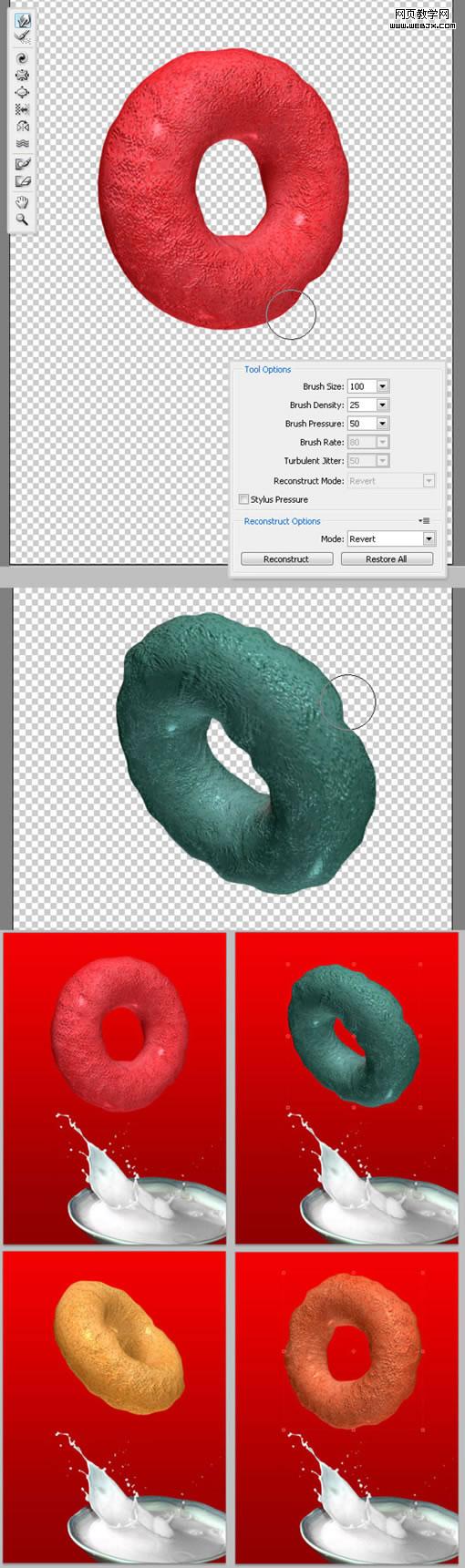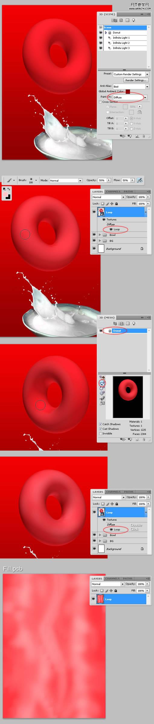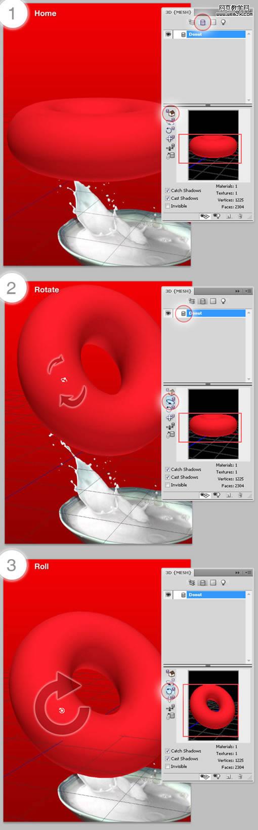 現(xiàn)在你的甜麥圈看起來有點像下圖中的最后一張了。這一步很終于因為我們馬上將會再進(jìn)行很多次3d變換。在繼續(xù)之前,請再多練習(xí)一下網(wǎng)格選項中的有關(guān)功能。記住photoshop不是一款構(gòu)造3d建模軟件,所以如果你要修改網(wǎng)格本身的話還要借助其他的軟件。