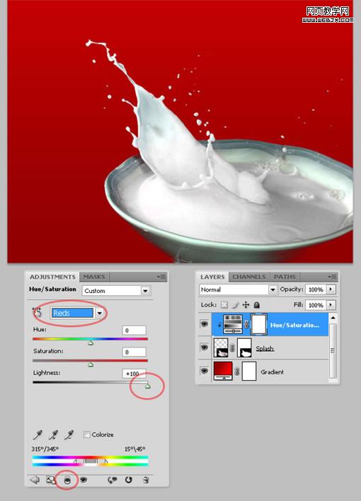 圖片中的牛奶看起來帶有一點粉紅色,要將它變得白一些只需要加上一層色調(diào)和飽和度調(diào)整圖層,在顏色選擇器中選擇紅色,將亮度調(diào)到100,確保點選了“clipping masking”這個選項使得調(diào)整的效果只發(fā)生在一個圖層上,在這里就是“splash”這個圖層。現(xiàn)在我們將這個牛奶碗暫且擱置,因為我們要開始創(chuàng)作甜麥圈了。最后將“splash”和調(diào)整圖層都加到一個叫“bowl”的文件夾中。