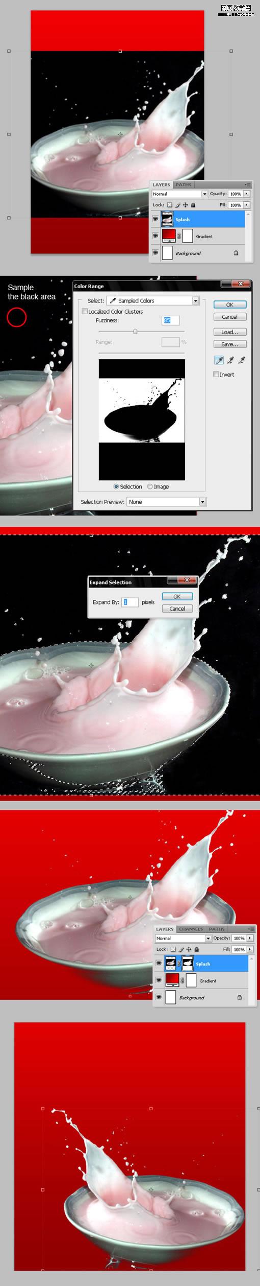 將牛奶婉復(fù)制到一個新的圖層,命名為“splash”,然后我們要去掉黑色的背景:選擇select>color range, 對黑色背景取樣然后將羽化調(diào)到85左右,然后按確定來完成。然后將已選擇的選區(qū)擴(kuò)大1px,然后創(chuàng)建一個快速蒙版或圖層蒙版將背景隱藏。最后將圖像水平翻轉(zhuǎn),將其移到畫面的右下角。
