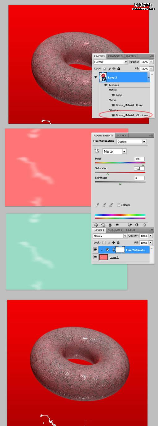在圖層面板中雙擊“loop2”的diffuse圖層,你將會看到我們在第九步中創(chuàng)建的紋理。要是顏色改變變得簡單,我們會使用色調(diào)和飽和度調(diào)整圖層。保存更改,關(guān)閉文檔,檢查下看起來怎么樣吧。
