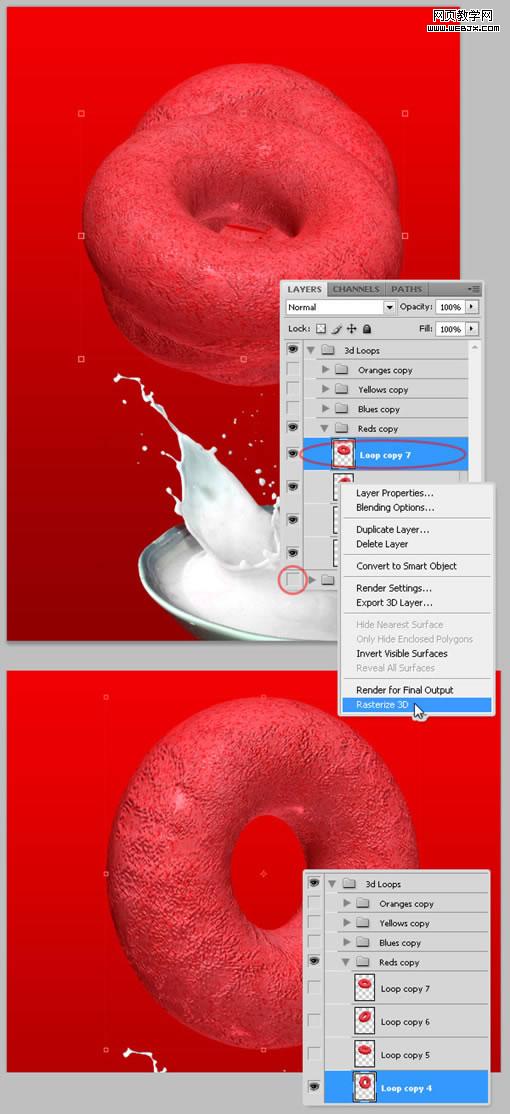 創(chuàng)造一個“3d loops”文件夾的復(fù)件,隱藏掉本來的那個文件夾,以防你要在后面的處理中用到任何一個3d圖層。現(xiàn)在對“3d loops”文件夾中每一個單獨的3d圖層進(jìn)行光柵處理。右擊3d圖層并且選擇rasterize 3d 這一選項。