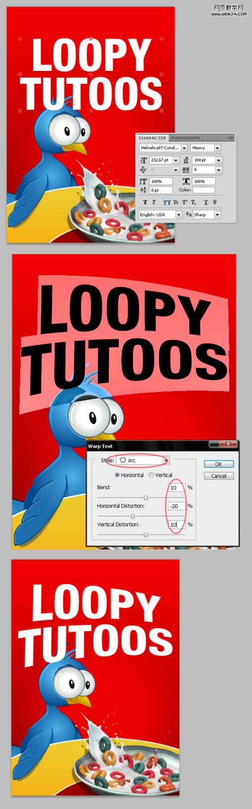打上這粘糊糊的谷物食品的名字吧,使用黑體和較細(xì)的字體,全部用大寫。使用text warp 選項來使字體彎曲一些。