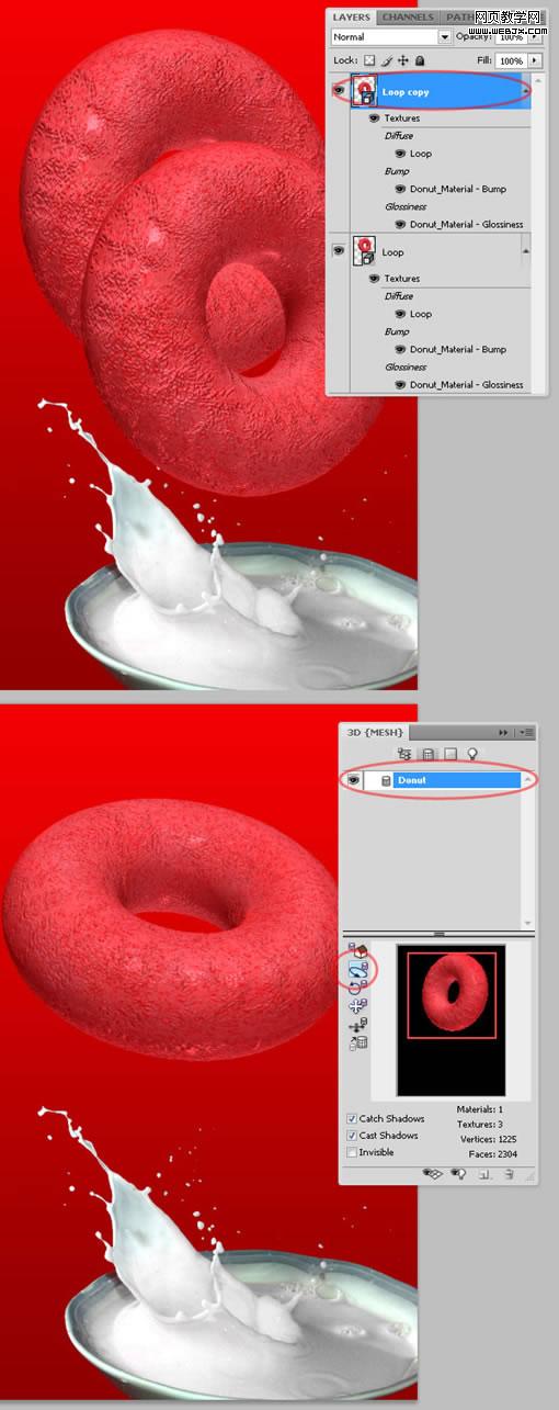 接下來選擇:window > 3d以顯示3d工具面板,現(xiàn)在選擇3d > new shape from layer > donut來自動創(chuàng)建一個名為“loop”的3d圖層,將它放在這,我們進(jìn)行下面的步驟。