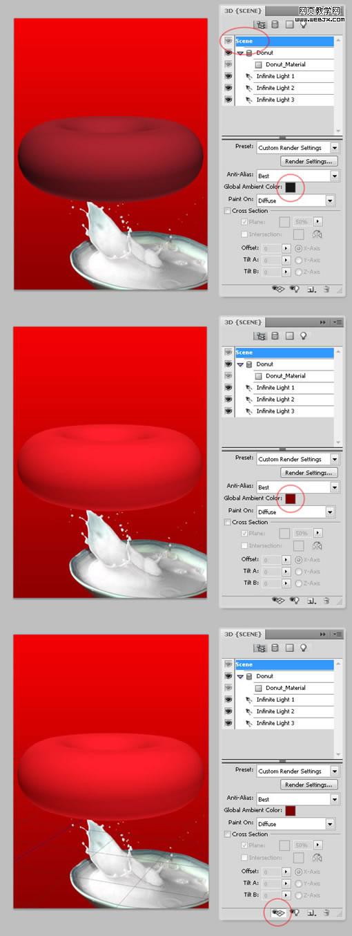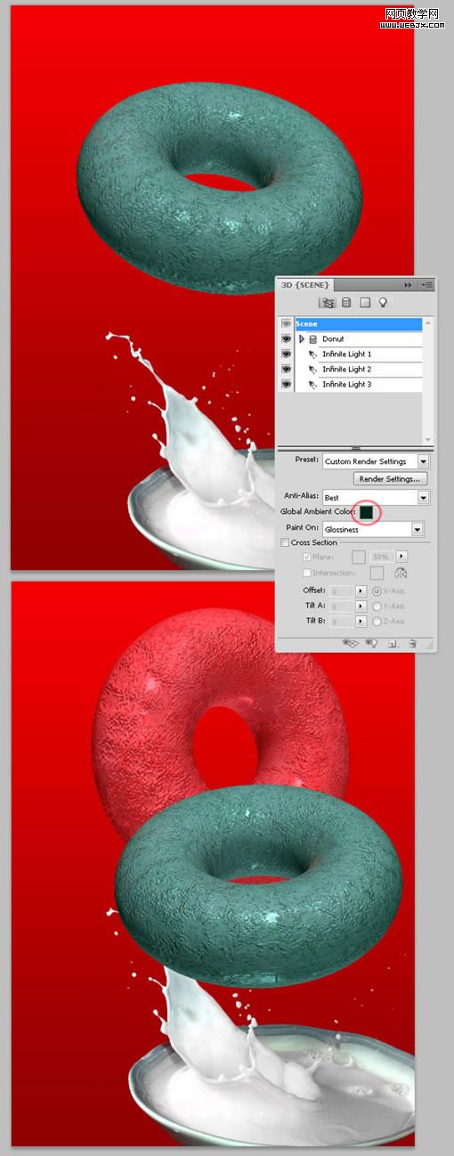 最后,要完成新增加的甜麥圈,在3d scene中改變它的周圍的顏色,以使它和背景更為協(xié)調(diào),這里我們可以用#01261e這個顏色。