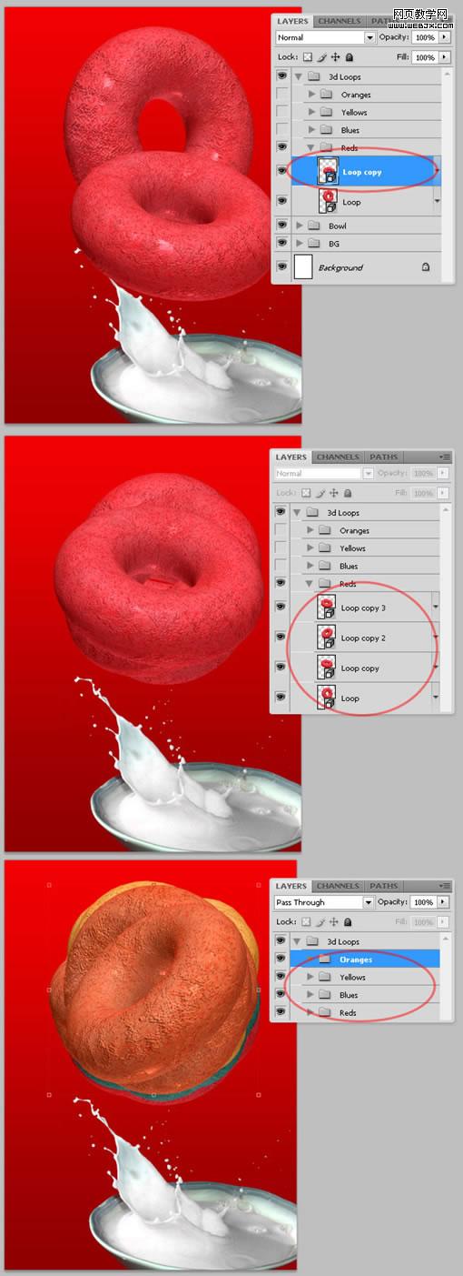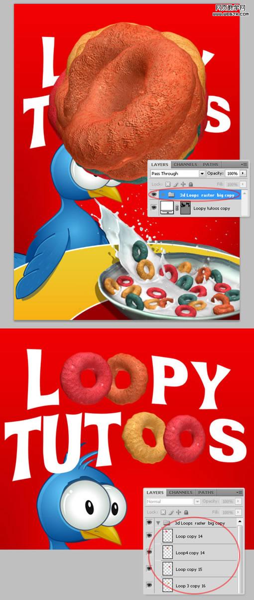 還記得第二十步中的“3d loops raster big”文件夾么?現(xiàn)在又到了用它的時候了,使該文件夾可見,將它復(fù)制并且將其置于最上層。然后選擇4個甜麥圈,刪去其他,然后用甜麥圈取代原來“o”的位置。