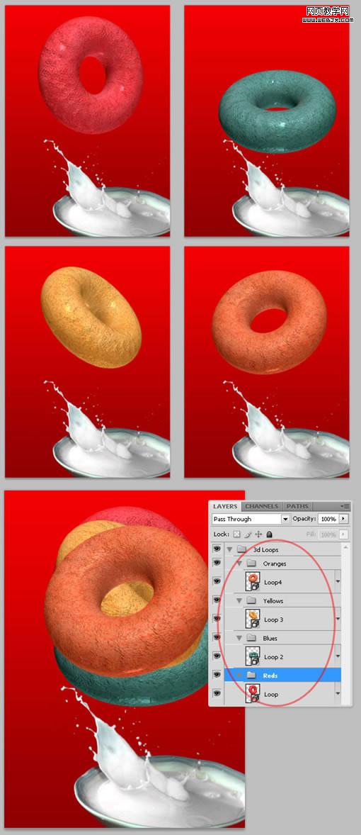 重復(fù)第12到第15步來制作更多不同樣式的甜麥圈,顏色完全取決于你。記住要使你的圖層有條理,我創(chuàng)造了一個“3d loops”的文件夾和四個子文件夾來放這些圖層。