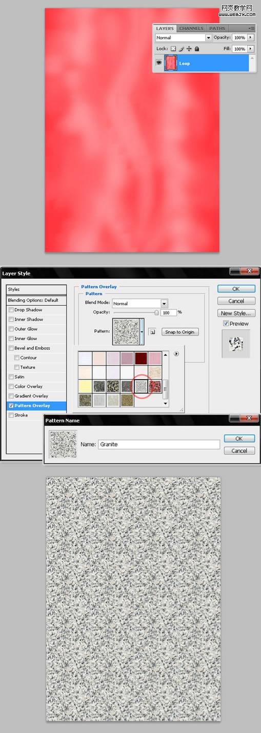 擇“loop”這一圖層,在這個圖層上添加patter overlay effect效果,我選擇的是 內(nèi)建在ps中的名為“granite”的巖石圖案,不過你也可以選擇其他的圖案紋理。要保持圖層顏色,選擇效果渲染模式為soft light,最后保存這個文件,回到主文檔,看看現(xiàn)在的紋理怎么樣了。