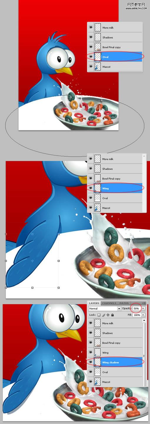 接下來我們將要增加一些背景中的細(xì)節(jié),在這一步中我在吉祥物前加入一個白色的橢圓。選擇并且復(fù)制鳥翅膀的一部分然后將其粘貼到橢圓中,然后復(fù)制翅膀這部分,降低它的亮度和透明度,然后然后將其置于原件的下層以便制作細(xì)微的陰影。