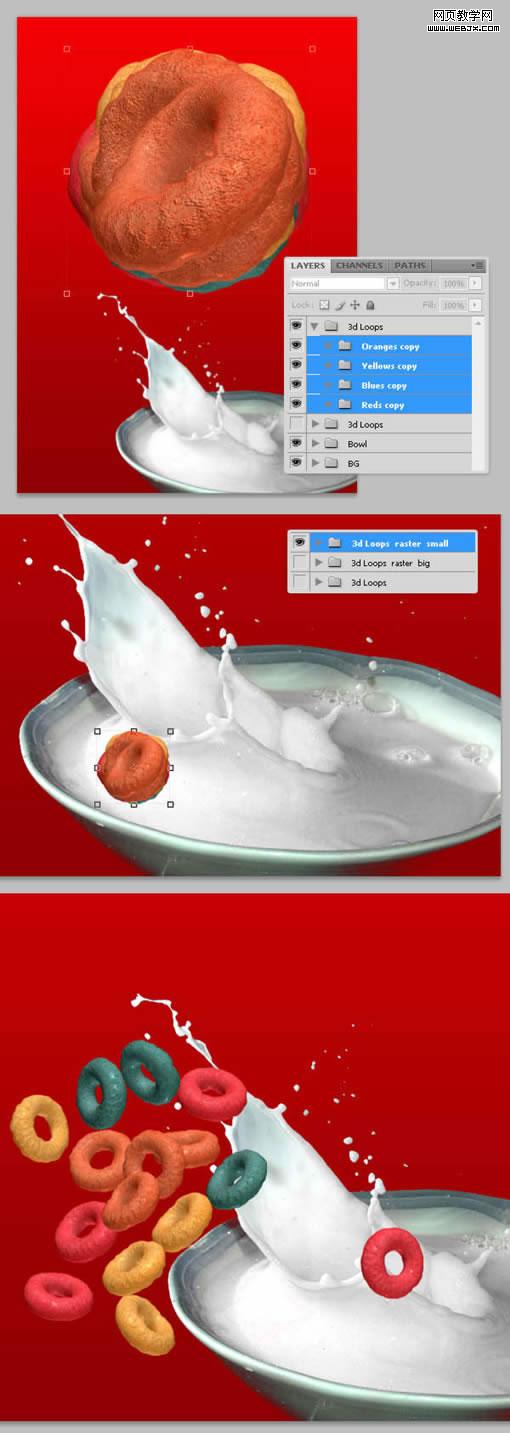 現(xiàn)在我們手頭有一把美味的甜麥圈了,我們現(xiàn)在要把它們放到牛奶碗中。首先,將含有光柵處理過的甜麥圈的文件夾復(fù)制一份,隱藏原來的那個。將復(fù)制的那個命名為“3d loops raster small”。然后改變整個文件夾的大小以使得甜麥圈足夠小。現(xiàn)在使用移動工具將這些甜麥圈隨機分布。