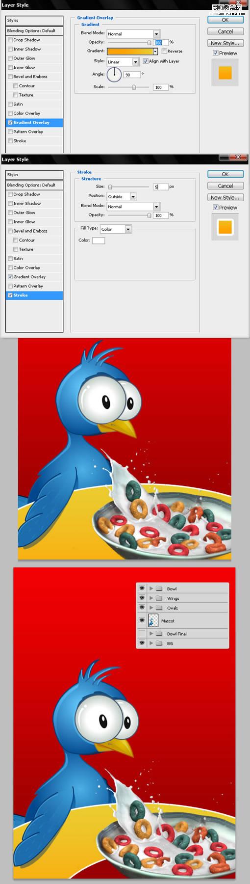 我為”logobg“使用一個紅色漸變覆蓋,黃色描邊和黑色投影的效果。你也可以添加自己想要的效果,將”logo“文件夾置于”mascot“圖層的下方。我同時也為這只小鳥增加了一個投影效果。