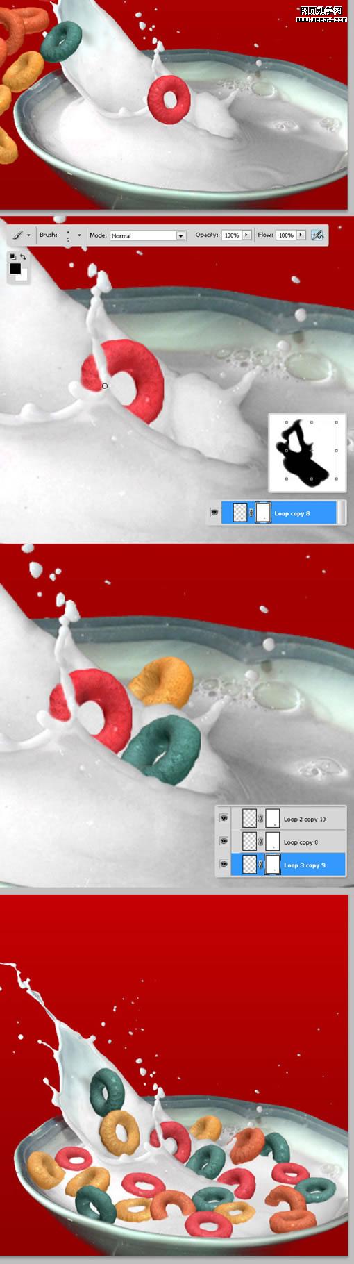 抓取任一甜麥圈拖動到牛奶碗的上方,試著使它覆蓋牛奶濺出的部分。然后選擇上述甜麥圈,然后添加一個顯示全部的圖層蒙版。選擇這一蒙版并選取小一些的畫筆,將甜麥圈沒入牛奶中的部分隱藏,對所有甜麥圈重復(fù)上述動作。這可能是整個教程中最困難的地方,因為你要不斷的改變甜麥圈的擺放。