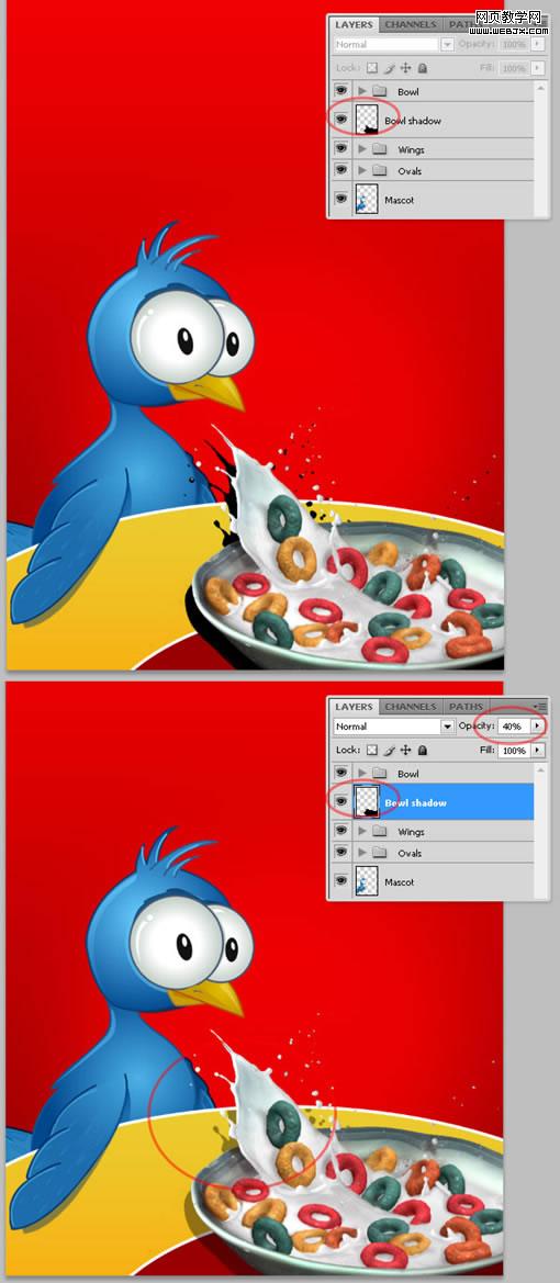 復(fù)制“bowl”圖層,將其命名為“bowl shadow”并且用色調(diào)和飽和度選項將其亮度調(diào)至-100。刪去背景橢圓外部的陰影,將其不透明度調(diào)至40%。