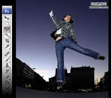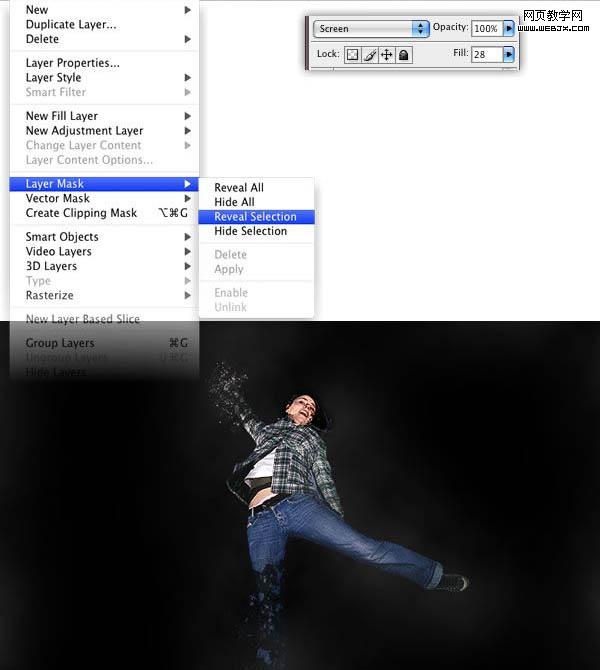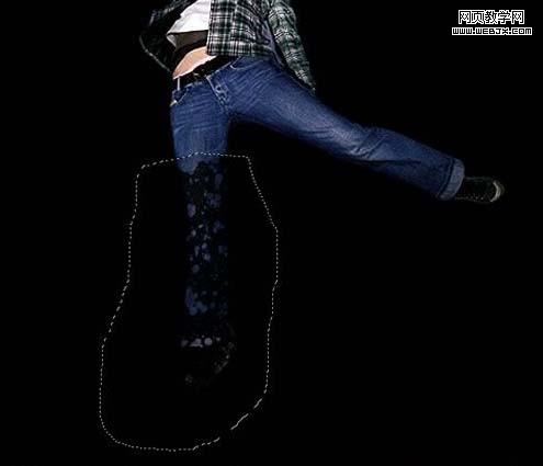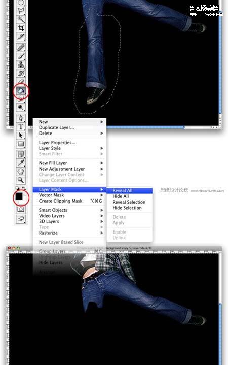4、正如我做的,用套索工具,選擇女孩的腿,然后到圖層>圖層蒙版>顯示全部。緊接著,用油漆桶工具將選區(qū)填充為黑色。一定要保證把選區(qū)給填充了。