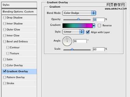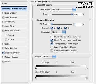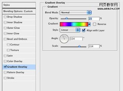 打開圖層樣式對(duì)話框,將填充不透明度設(shè)置成0,然后選擇漸變疊加。將不透明度設(shè)置成20%,用下圖所示的彩虹顏色。