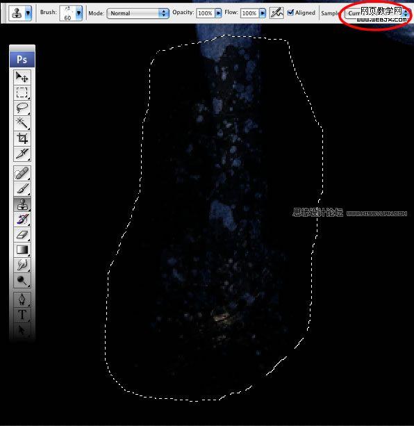 在這個(gè)圖層上面新建一個(gè)圖層,然后選擇仿制圖章工具。在樣本設(shè)置中選擇當(dāng)前和下方圖層。如果你以前沒用過仿制圖章工具,首先要做的是設(shè)置一個(gè)取樣點(diǎn),按住alt鍵同時(shí)選擇取樣點(diǎn)。緊接著,開始仿制腿上爆破的部分,以便將碎片散開。最后要做的是到濾鏡>銳化>銳化。