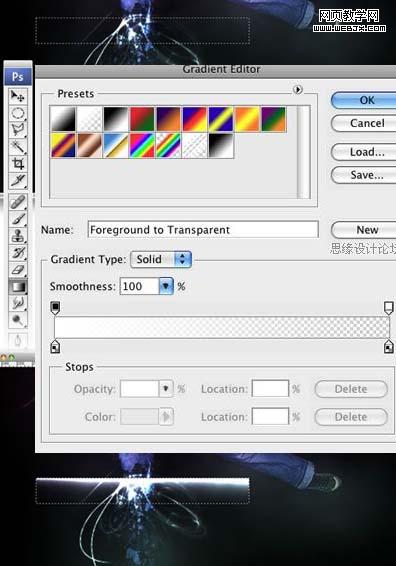 11、在“lights”組中新建一個(gè)新的圖層。選擇矩形選框工具,確定羽化為0px。新建一個(gè)矩形選區(qū)。然后選擇漸變工具。至于顏色,開始和結(jié)尾都是用白色,但是要將結(jié)尾的不透明度設(shè)置成0.然后用如下圖所示的漸變填充矩形選區(qū)。