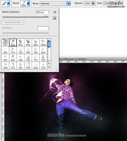 5、現(xiàn)在我們需要一些筆刷。你可以到網(wǎng)上下載一些筆刷。我用了一套叫血斑的筆刷。 選擇畫筆工具,然后設(shè)置前景色為白色。選擇一個(gè)畫筆。我用了這套筆刷中的第一個(gè),并將它的大小設(shè)置成300,也可以更小。緊接著,開始涂已經(jīng)消失的腿。為了得到很好的效果,你需要用筆刷多點(diǎn)幾次。