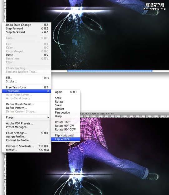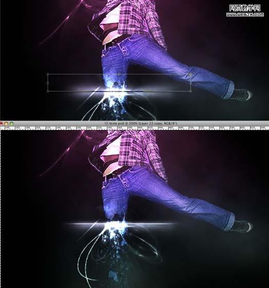 13、復(fù)制圖層,到編輯>變換>垂直翻轉(zhuǎn)。然后到編輯>變換>縮放,然后降低高度。緊接著,合并這兩個(gè)圖層。你可以通過復(fù)制,旋轉(zhuǎn)和縮放,制作更多的光效。