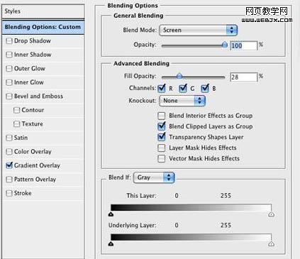 9、在云彩圖層上方雙擊打開圖層樣式對(duì)話框。首先要做的是,將混合模式設(shè)置成正片疊底,填充不透明度設(shè)置成28%。然后到漸變疊加。混合模式設(shè)置成顏色減淡,不透明度設(shè)置成55%。使用下圖所示的顏色。