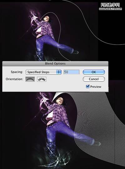 14、在illustrator中,選擇鋼筆工具,制作兩條曲線。當(dāng)你點(diǎn)擊的時(shí)候,按住鼠標(biāo)左鍵不動(dòng),即可創(chuàng)建一個(gè)描點(diǎn)。筆畫的粗細(xì)設(shè)置成0.5pt。緊接著,用混合工具在一條線上點(diǎn)擊,然后再在另一條線上點(diǎn)擊。為了改變混合屬性,雙擊混合圖標(biāo)。為空白區(qū)域選擇具體的條數(shù),比如用50條。復(fù)制混合。