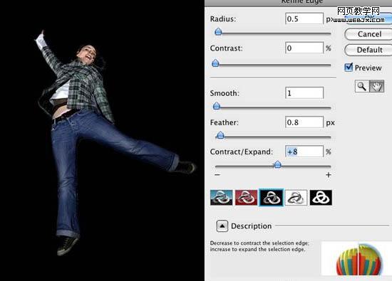 2、用多邊形套索工具選擇女孩。完成選區(qū)操作后,到選擇>修改邊緣。一個(gè)需要設(shè)置參數(shù)的對(duì)話框就會(huì)打開。將預(yù)覽方式設(shè)置成黑色,做一些修改,直到完美為止。增加些許羽化,半徑,不要忘了擴(kuò)大選區(qū)。最后按確認(rèn)即可。
