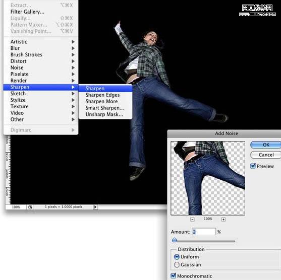 3、反選選區(qū),選擇>反向并刪除背景。之后,到濾鏡>銳化>銳化,然后到濾鏡>雜色>添加雜色。設(shè)置2%的雜色數(shù)量。