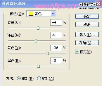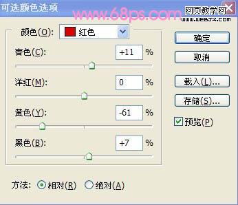 2、創(chuàng)建可選顏色調(diào)整圖層,參數(shù)設(shè)置如圖3 - 7,效果如圖8。
