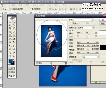 4.添加光照效果。執行濾鏡中的“光照效果”命令為圖像添加特殊效果。如圖13所示。并執行“亮度/對比度”命令調整圖像的反差。如圖14所示。