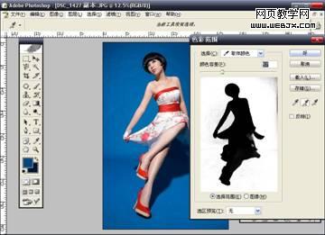 3.摳圖。為了進行下一步的光照效果的制作,這里需要將人物摳出。執行“色彩范圍”命令,是人物與背景分離,從而摳出人物。之后對選區中的人物進行復制。如圖11、圖12所示。