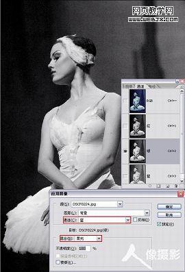 注:“應(yīng)用圖像”命令可以將一個(gè)圖像的圖層和通道(源)與當(dāng)前圖像(目標(biāo))的圖層和通道混合,產(chǎn)生合成效果。