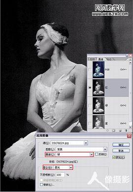 3、分別調(diào)整通道的色彩。使用“應(yīng)用通道”命令,分別對(duì)紅、綠兩個(gè)通道進(jìn)行調(diào)整,以增加圖像的反差。點(diǎn)擊通道面板,單擊紅通道,并選擇“應(yīng)用圖像”命令。如圖3所示。在紅色通道面板中,將通道改為“綠”,并將“混合”改為“柔光”,如圖4所示。再單擊通道面板中的綠通道,同樣使用“應(yīng)用圖像”命令,將通道改為“藍(lán)”,并將“混合”改為“柔光”,如圖5所示。