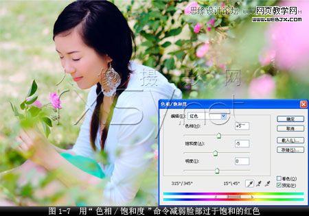 8.將圖像由lab顏色模式轉換回rgb顏色模式后,用“色相/飽和度”命令對紅色飽和度進行調整,減弱人物臉部的紅色成分,如圖1-7所示。
