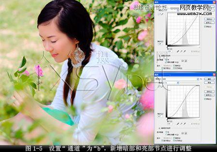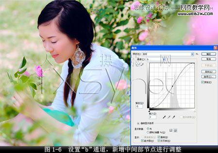 4.調整b通道的曲線,從而校正上一步調整時出現的偏色問題。設置“通道”為“b”,新增左邊暗部節點“輸出”值為“-128”,“輸入”值為“-110”,接著,新增右邊亮部節點“輸出”值為“127”,“輸入”值為“110”,更加完善和豐富畫面的色彩層次,有效校正因執行上面操作步驟存在的一定色偏,如圖1-5所示。
