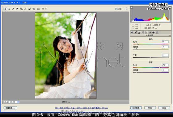7、調整人物膚色。在“camera raw編輯器”對話框中打開“分離色調面板”,設置“高光色相”值為“50”,“高光飽和度”值為“10”,“陰影色相”值為“270”,“陰影飽和度”值為“10”,其它設置保持默認值,使人物膚色更加飽滿,如圖2-8所示。