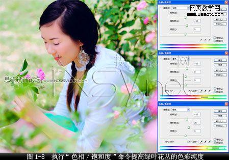 9.最后,用“色相/飽和度”命令對全圖及圖像中的黃色和綠色部分的色相飽和度進行調整。全圖 “飽和度”設置值為“10”,選取“黃色”設置“色相”值為“10”,選取“綠色”,設置“色相”值為“10”,“飽和度”值為“20”,其他設置均保持默認值,提高綠葉花叢的色彩純度,如圖1-8所示。