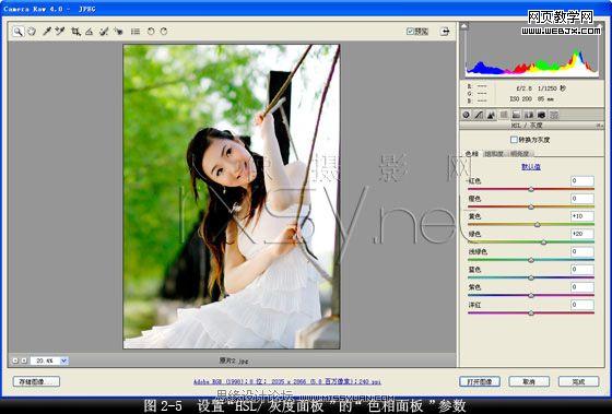 4. 強調著重黃綠色調。在“camera raw編輯器”對話框中打開“hsl/灰度面板”設置“色相面板”上“黃色”值為“10”,“綠色”值為“20”,其它設置保持默認值,加強自然色彩的純度,著重黃綠色調,如圖2-5所示。